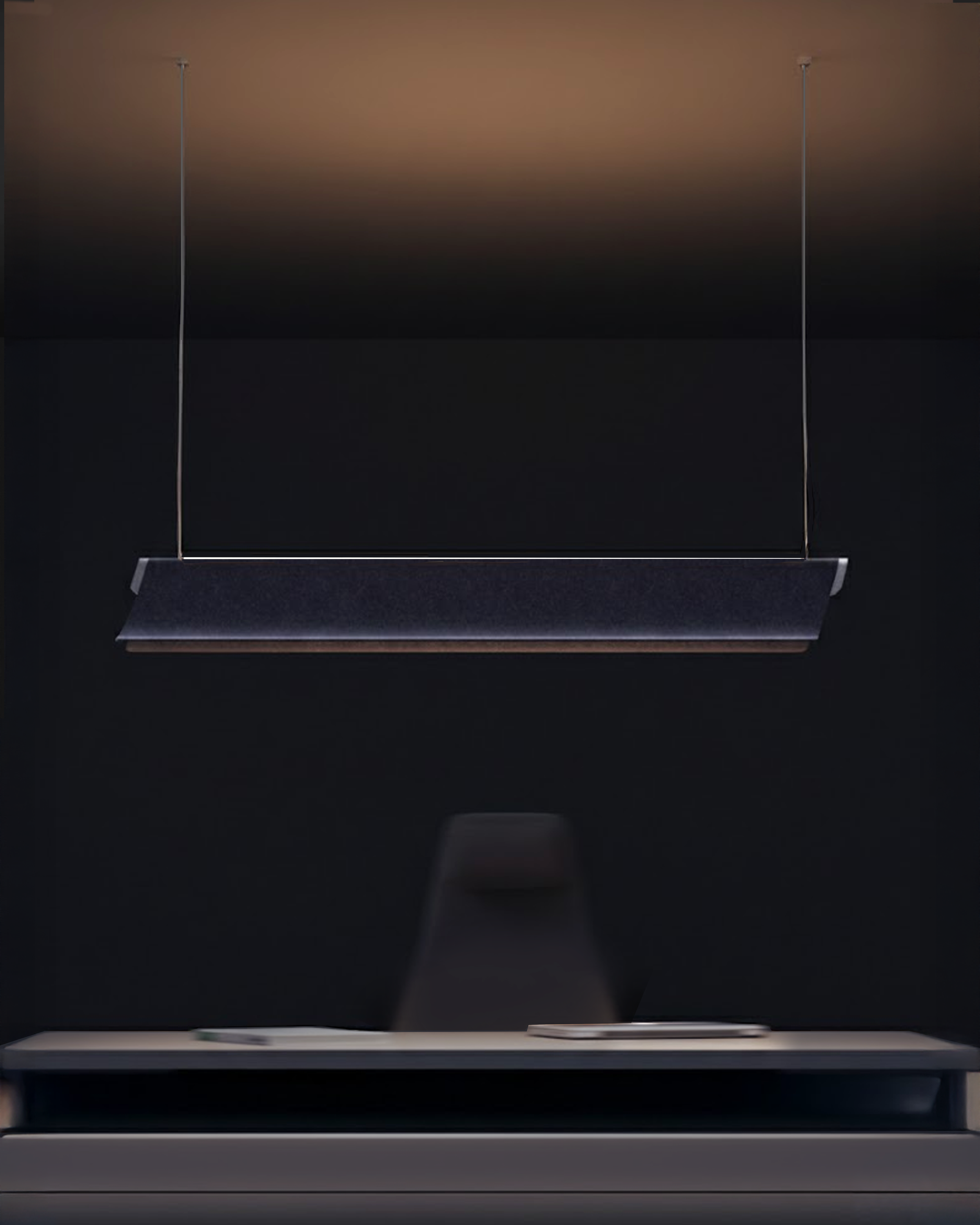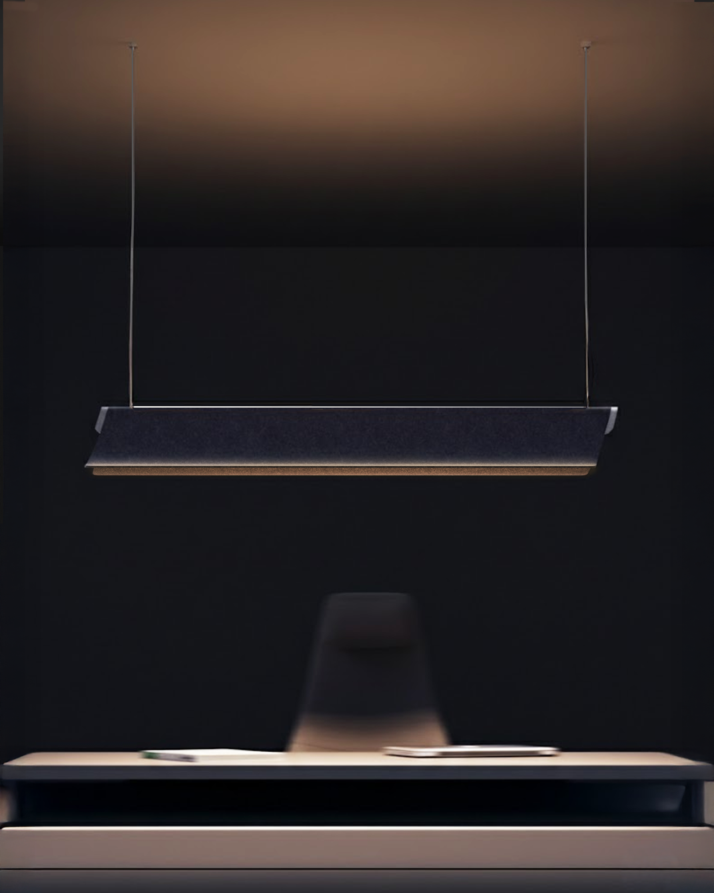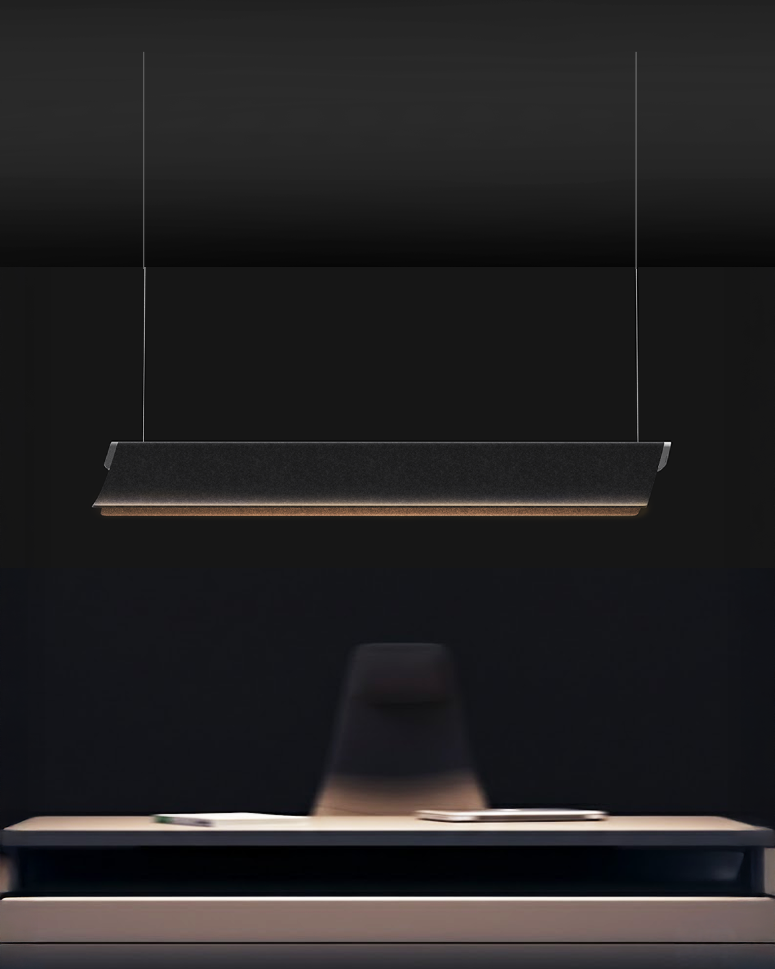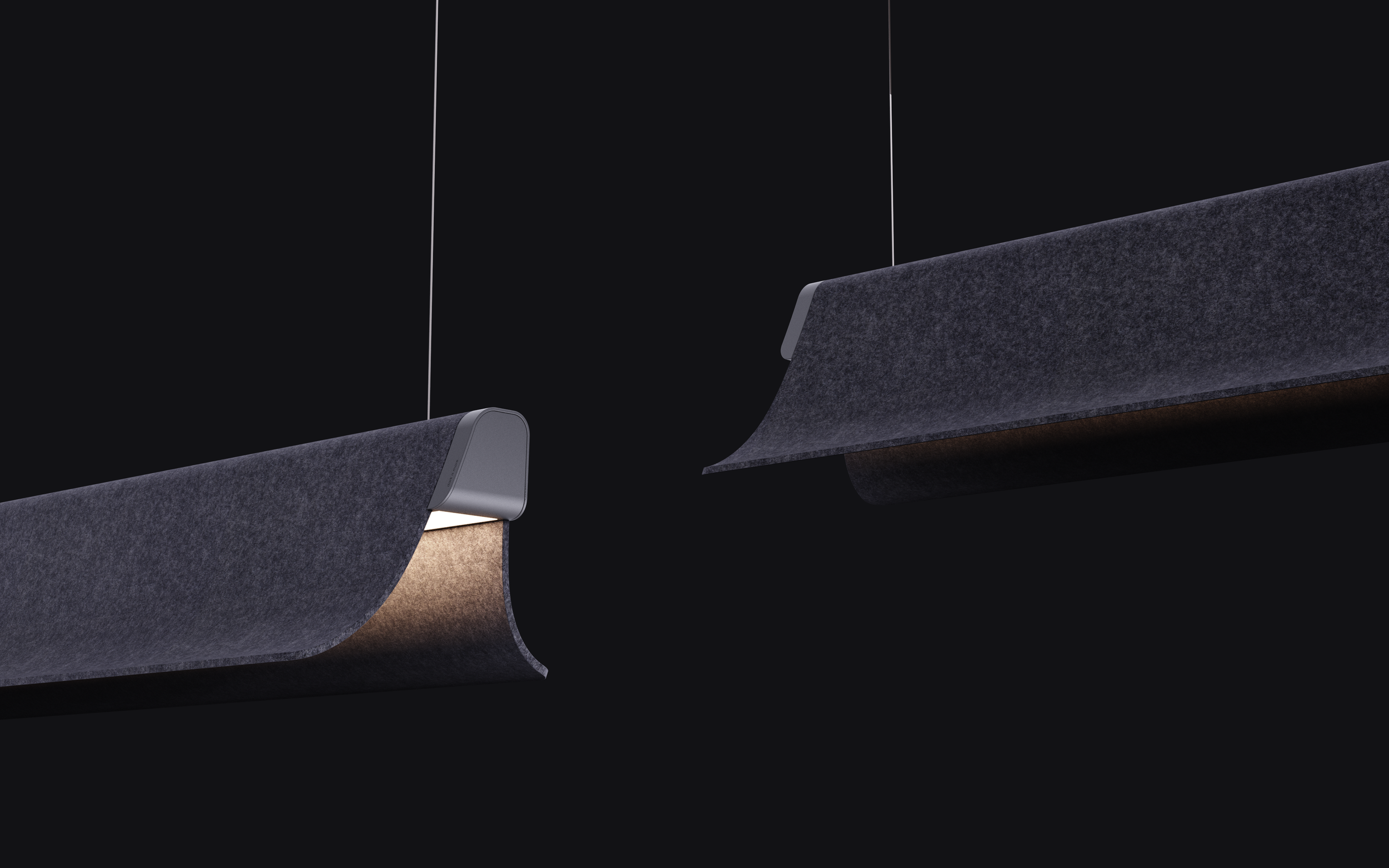 While light defines the space softly, the acoustic surface calms the sound.